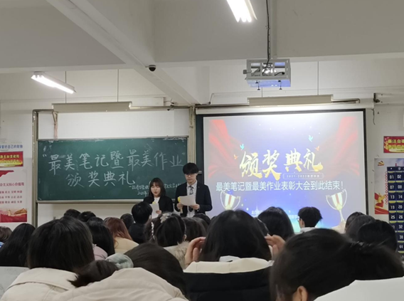 其次,由主持人宣布获奖名单并请老师为获奖者颁奖,最美笔记获得一等奖的是王丽,黎毓柔两位同学,最美作业获得一等奖的是陈婷婷,孔亚静两位同学,由段联合老师颁奖;最美笔记获得二等奖的是陈冰冰,李慧,徐铭君三位同学,最美作业获得二等奖的是乔佳佳,刘润祥,李佳仪三位同学,由滕风华老师颁奖;最美笔记获得三等奖的是李梦霜,张莎莎,文芹芹,袁珍,袁飘五位同学,最美作业获得三等奖的是何家惠,沈娅萱,杨佳荷,杨俊华,黄舒雅五位同学,由郭金勇老师颁奖。