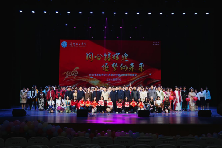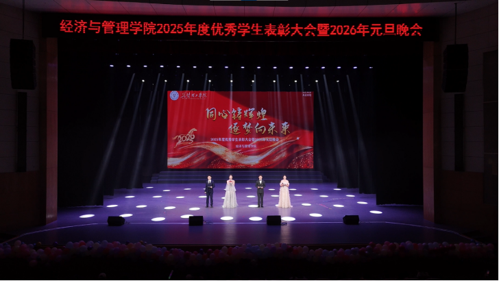 表彰环节结束后,师生联袂奉献的元旦文艺晚会精彩上演。晚会节目形式多样,涵盖舞蹈、歌曲、小品、朗诵等。充满朝气的开场舞《发财发福中国年》迅速点燃现场气氛;汉服秀《岁华宴》演绎了传统文化之美;教师节目《舞动青春》体现了创新协作、昂扬向上的精神…13个节目分“往昔皆璀璨”、“今朝绽芳华”、“未来启新程”三篇章层层推进,既彰显经管学子青春活力,又传递对新年的美好期许。