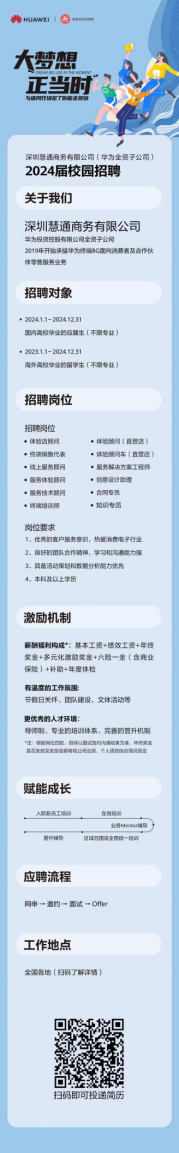 华为慧通2024届秋季校园招聘研后补录正式开启补录岗位:体验店顾问、终端销售代表、服务体验顾问、服务技术顾问简历投递时间:2023.12.27-2024.01.07薪资待遇:基本薪资+绩效+补贴+提成工作地点:全省各地市简历投递:请扫图中二维码进行简历投递